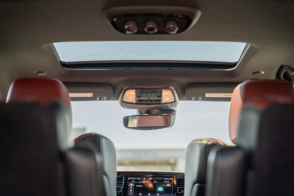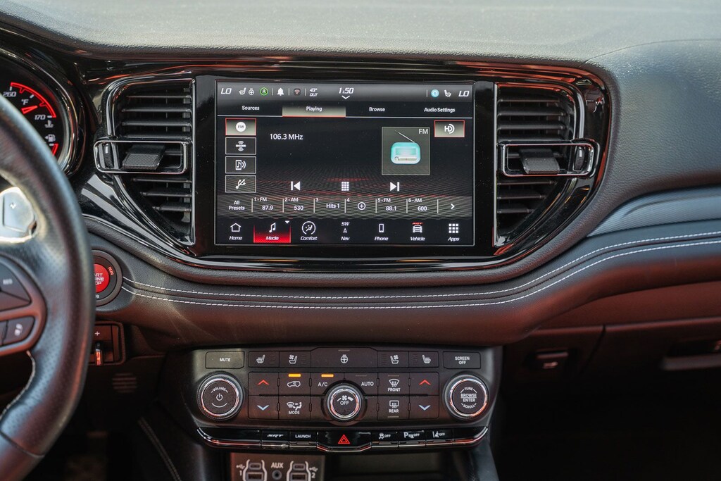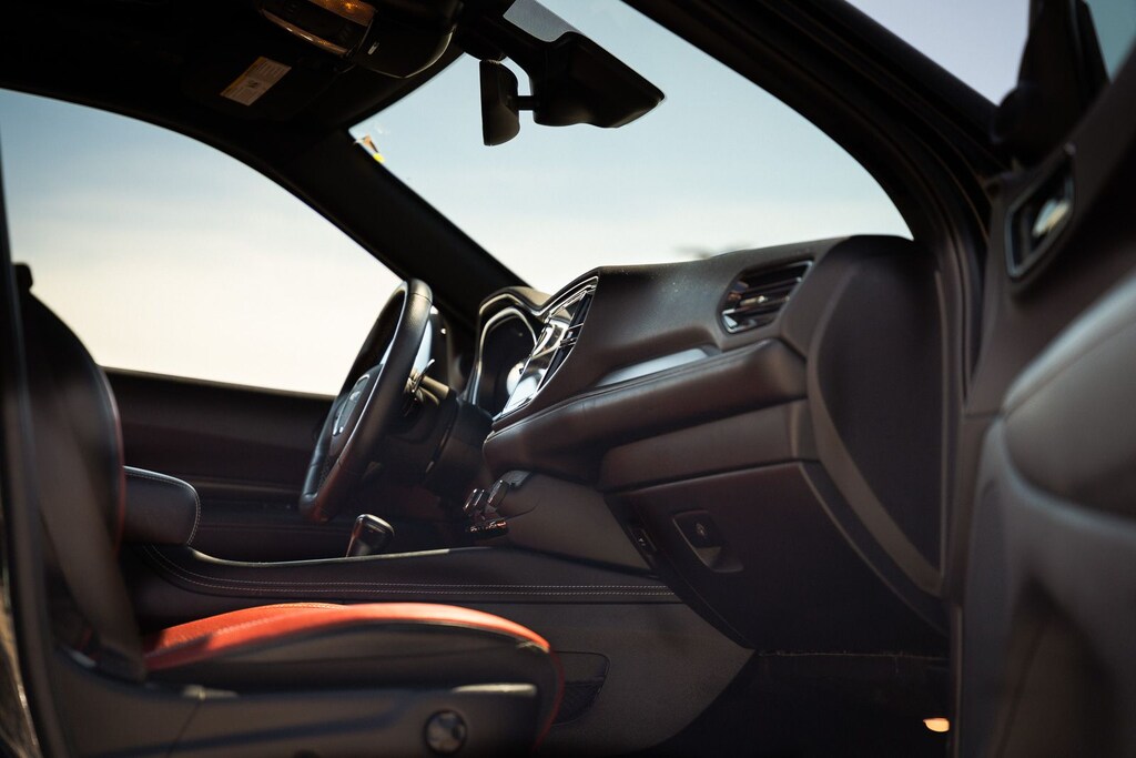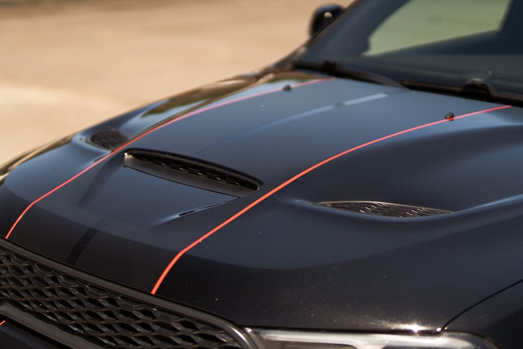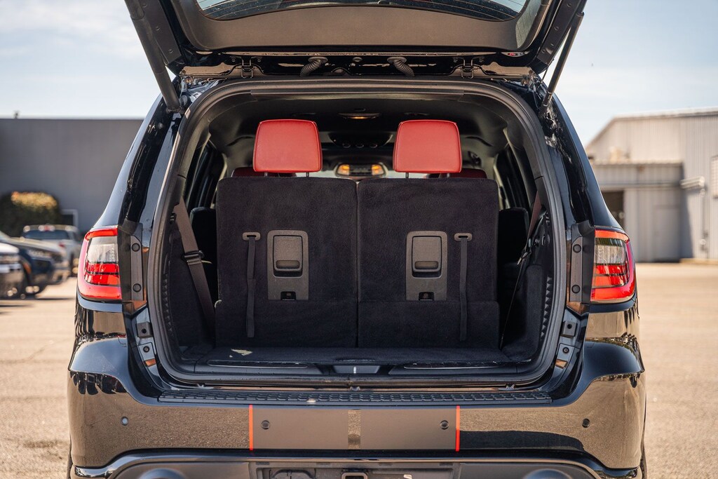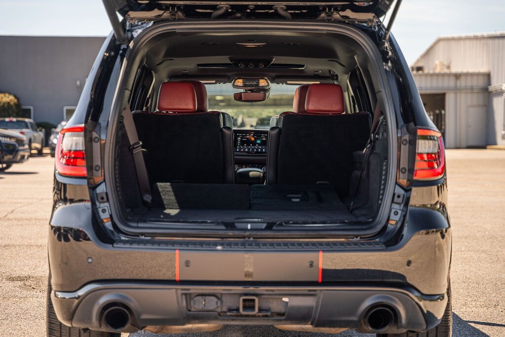 This vehicle comes equipped with Black Package (Eclipse Black Exhaust Tips, Gray Metallic Badges, Satin Black Dodge Tail Lamp Badge, and Wheels: 20" x 10" Lights Out Aluminum), Quick Order Package 29M SRT 392 Plus (7 & 4 Pin Wiring Harness, Adaptive Cruise Control w/Stop, Advanced Brake Assist, Black Roof Rails, Blind Spot w/Trailer Detection, Class IV Receiver Hitch, Full Speed Forward Collision Warning Plus, High Performance Laguna Leather Seats, Integrated Roof Rail Crossbars, Lane Departure Warning Plus, and Power Sunroof), Dodge Certified, AWD, 2nd Row Mini Console w/Cupholders, 3.70 Rear Axle Ratio, 3rd Row Floor Mat & Mini Console, 3rd row seats: split-bench, 4-Wheel Disc Brakes, 9 Speakers, ABS brakes, Adaptive suspension, Air Conditioning, Alloy wheels, AM/FM radio: SiriusXM w/360L, Apple CarPlay/Android Auto, Audio memory, Auto High-beam Headlights, Auto-dimming door mirrors, Auto-dimming Rear-View mirror, Automatic temperature control, Brake assist, Bumpers: body-color, Compass, Delay-off headlights, Driver door bin, Driver vanity mirror, Dual front impact airbags, Dual front side impact airbags, Electronic Stability Control, Emergency communication system, Four wheel independent suspension, Front anti-roll bar, Front Bucket Seats, Front Center Armrest w/Storage, Front dual zone A/C, Front reading lights, Fully automatic headlights, Garage door transmitter, Gloss Black Exterior Mirrors, Heated door mirrors, Heated front seats, Heated rear seats, Heated steering wheel, Illuminated entry, Knee airbag, Leather Shift Knob, Leather steering wheel, Leather Trimmed Bucket Seats, Low tire pressure warning, Memory seat, MOPAR Dual Stripes- Redline Red/Black, Navigation system: TomTom, Occupant sensing airbag, Outside temperature display, Overhead airbag, Overhead console, Panic alarm, ParkView Rear Back-Up Camera, Passenger door bin, Passenger vanity mirror, Power door mirrors, Power driver seat, Power Liftgate, Power passenger seat, Power steering, Power windows, Radio data system, Radio: Uconnect 5 Nav w/10.1" Display, Rain sensing wipers, Rear air conditioning, Rear anti-roll bar, Rear reading lights, Rear window defroster, Rear window wiper, Remote keyless entry, Security system, Speed control, Speed-sensing steering, Speed-Sensitive Wipers, Split folding rear seat, Spoiler, Sport steering wheel, Steering wheel mounted audio controls, Tachometer, Telescoping steering wheel, Tilt steering wheel, Traction control, Trip computer, Turn signal indicator mirrors, Variably intermittent wipers, Ventilated front seats, Voltmeter, and Wheels: 20" x 10" Hyper Black Aluminum.