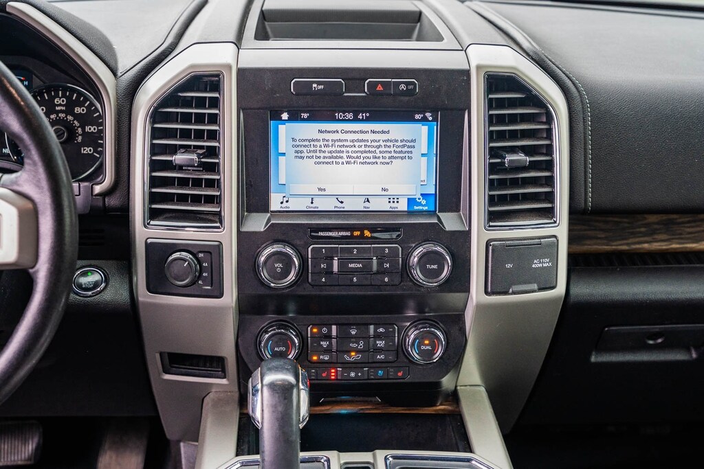 This vehicle comes equipped with F-150 Lariat, Ford Blue Certified Certified, 5.0L V8, 4WD, Black w/Leather-Trimmed Bucket Seats, 110V/400W Outlet, 18" Machined-Aluminum Wheels, 4-Wheel Disc Brakes, 7 Speakers, ABS brakes, Adjustable pedals, Air Conditioning, Alloy wheels, AM/FM radio: SiriusXM, AppLink/Apple CarPlay and Android Auto, Auto High-beam Headlights, Auto-dimming door mirrors, Auto-dimming Rear-View mirror, Automatic temperature control, Brake assist, Bumpers: chrome, Class IV Trailer Hitch Receiver, Compass, Delay-off headlights, Driver door bin, Driver vanity mirror, Dual front impact airbags, Dual front side impact airbags, Electronic Stability Control, Emergency communication system: SYNC 3 911 Assist, Exterior Parking Camera Rear, Front anti-roll bar, Front Center Armrest w/Storage, Front dual zone A/C, Front fog lights, Front reading lights, Front wheel independent suspension, Fully automatic headlights, Heated door mirrors, Heated front seats, Illuminated entry, Leather-Trimmed 40/20/40 Front Seat, Low tire pressure warning, Memory seat, Occupant sensing airbag, Outside temperature display, Overhead airbag, Overhead console, Panic alarm, Passenger door bin, Passenger vanity mirror, Pedal memory, Power door mirrors, Power driver seat, Power passenger seat, Power steering, Power windows, Radio data system, Radio: AM/FM Stereo w/6 Speakers, Rear reading lights, Rear seat center armrest, Rear step bumper, Rear window defroster, Remote keyless entry, Security system, SiriusXM Radio, Speed control, Speed-sensing steering, Split folding rear seat, Steering wheel mounted audio controls, SYNC 3, Tachometer, Telescoping steering wheel, Tilt steering wheel, Traction control, Trip computer, Turn signal indicator mirrors, Variably intermittent wipers, Ventilated front seats, and Voltmeter.