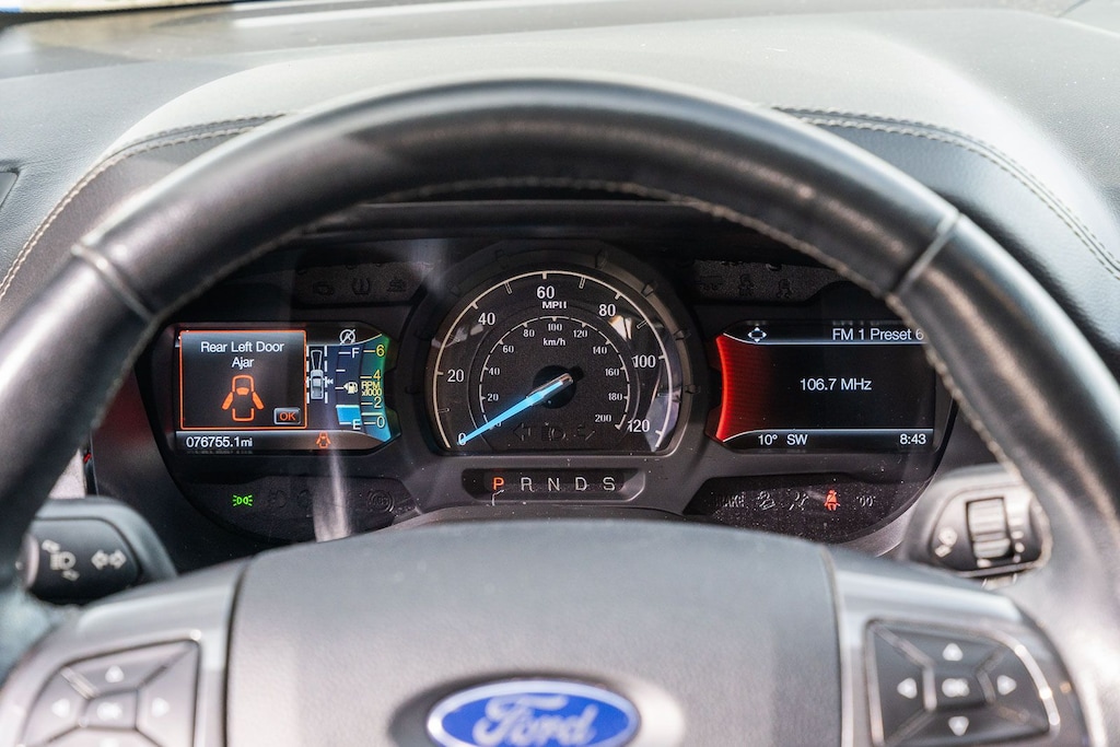 This vehicle comes equipped with Ford Certified, 4WD, 4-Wheel Disc Brakes, 6 Speakers, ABS brakes, Air Conditioning, Brake assist, Compass, Delay-off headlights, Driver door bin, Dual front impact airbags, Dual front side impact airbags, Electronic Stability Control, Exterior Parking Camera Rear, Front anti-roll bar, Front Bucket Seats, Front Center Armrest, Front wheel independent suspension, Fully automatic headlights, Illuminated entry, Low tire pressure warning, Occupant sensing airbag, Overhead airbag, Passenger door bin, Power steering, Power windows, Radio: AM/FM Stereo w/6 Speakers, Rear seat center armrest, Rear step bumper, Speed-sensing steering, Steering wheel mounted audio controls, TBD Axle Ratio, Telescoping steering wheel, Tilt steering wheel, Traction control, Trip computer, Variably intermittent wipers, and Voltmeter.