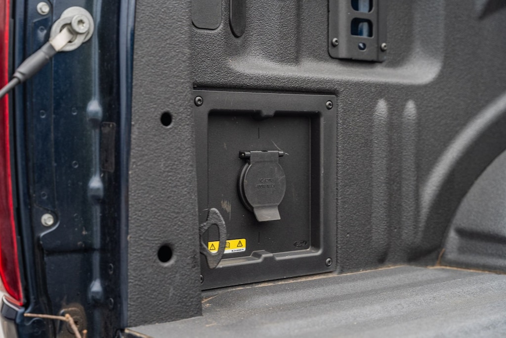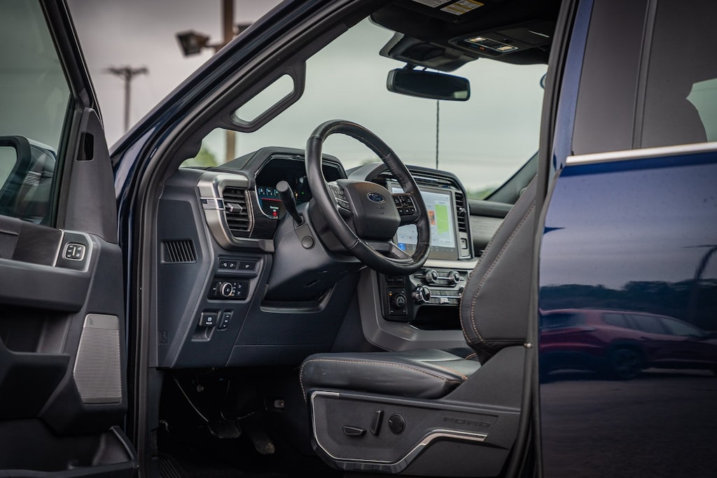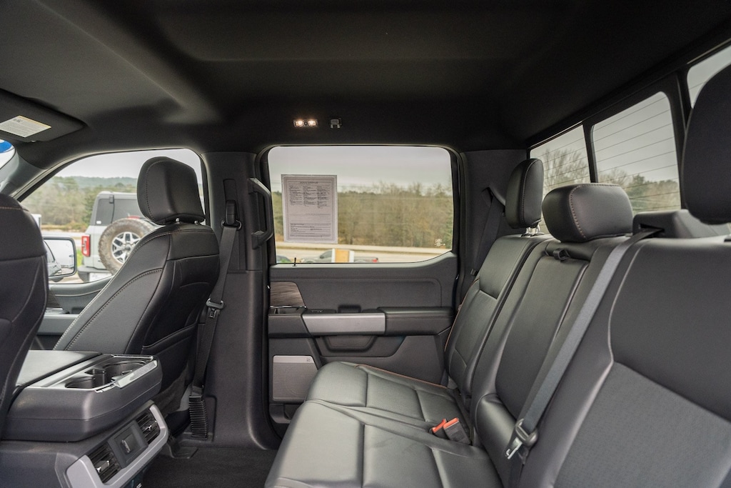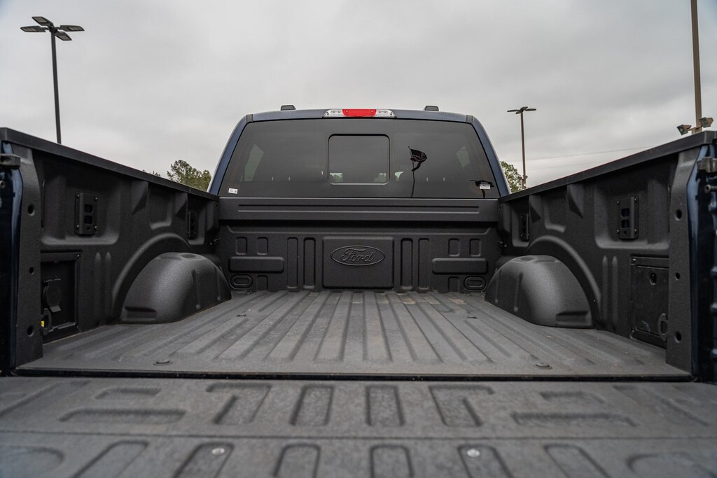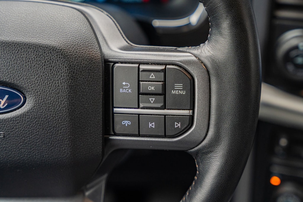 This vehicle comes equipped with Equipment Group 501A Standard, Tow/Haul Package, 4WD, 4-Wheel Disc Brakes, 8 Speakers, ABS brakes, Adjustable pedals, Air Conditioning, Alloy wheels, AM/FM radio: SiriusXM with 360L, Auto High-beam Headlights, Auto-dimming door mirrors, Auto-dimming Rear-View mirror, Automatic temperature control, Brake assist, Bumpers: chrome, Chrome wheels, Compass, Delay-off headlights, Driver door bin, Driver vanity mirror, Dual front impact airbags, Dual front side impact airbags, Electronic Stability Control, Emergency communication system: SYNC 4 911 Assist, Front anti-roll bar, Front Bucket Seats, Front Center Armrest, Front dual zone A/C, Front fog lights, Front reading lights, Front wheel independent suspension, Fully automatic headlights, Garage door transmitter, Heated door mirrors, Heated front seats, Heated steering wheel, Illuminated entry, Leather-Trimmed Bucket Seats, Low tire pressure warning, Memory seat, Navigation system: Connected Navigation, Occupant sensing airbag, Outside temperature display, Overhead airbag, Overhead console, Panic alarm, Passenger door bin, Passenger vanity mirror, Pedal memory, Power door mirrors, Power driver seat, Power passenger seat, Power steering, Power windows, Radio data system, Radio: B&O Sound System by Bang & Olufsen, Rain sensing wipers, Rear reading lights, Rear seat center armrest, Rear step bumper, Rear window defroster, Remote keyless entry, Security system, Speed control, Split folding rear seat, Steering wheel mounted audio controls, SYNC 4 w/Enhanced Voice Recognition, Tachometer, Telescoping steering wheel, Tilt steering wheel, Tough Bed Spray-In Bedliner, Traction control, Trip computer, Turn signal indicator mirrors, Variably intermittent wipers, Ventilated front seats, Voltmeter, and Wheels: 20" Chrome-Like PVD.