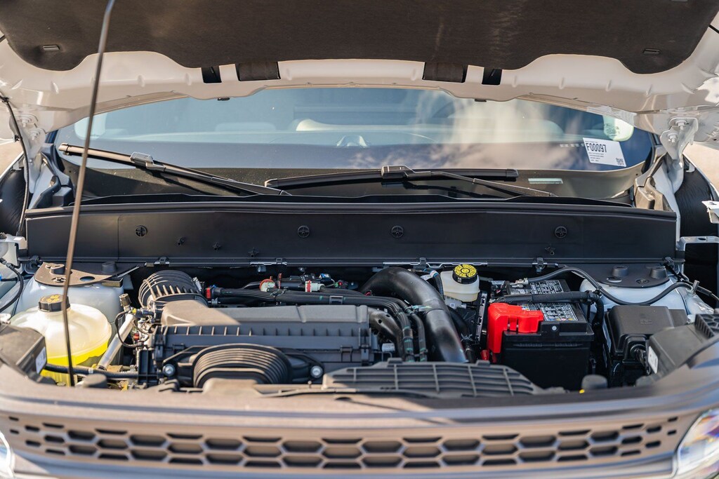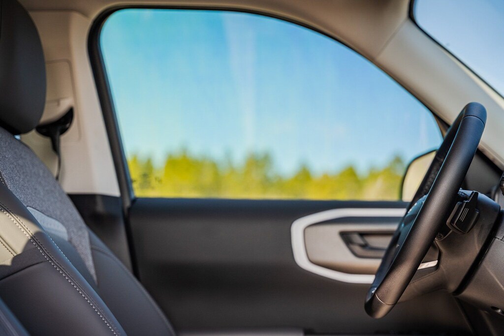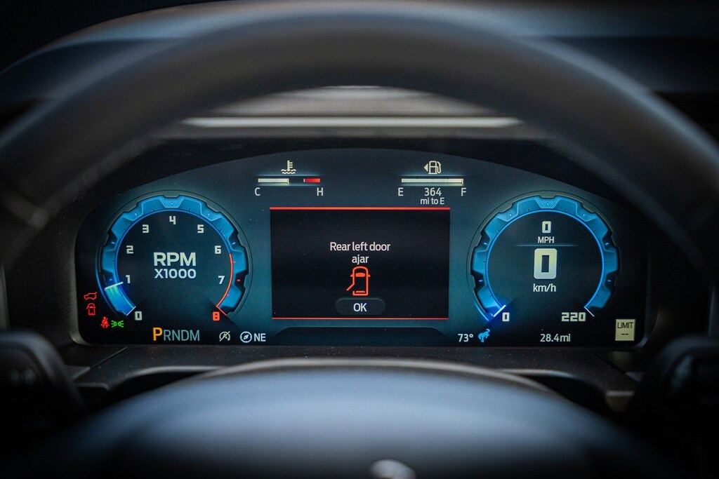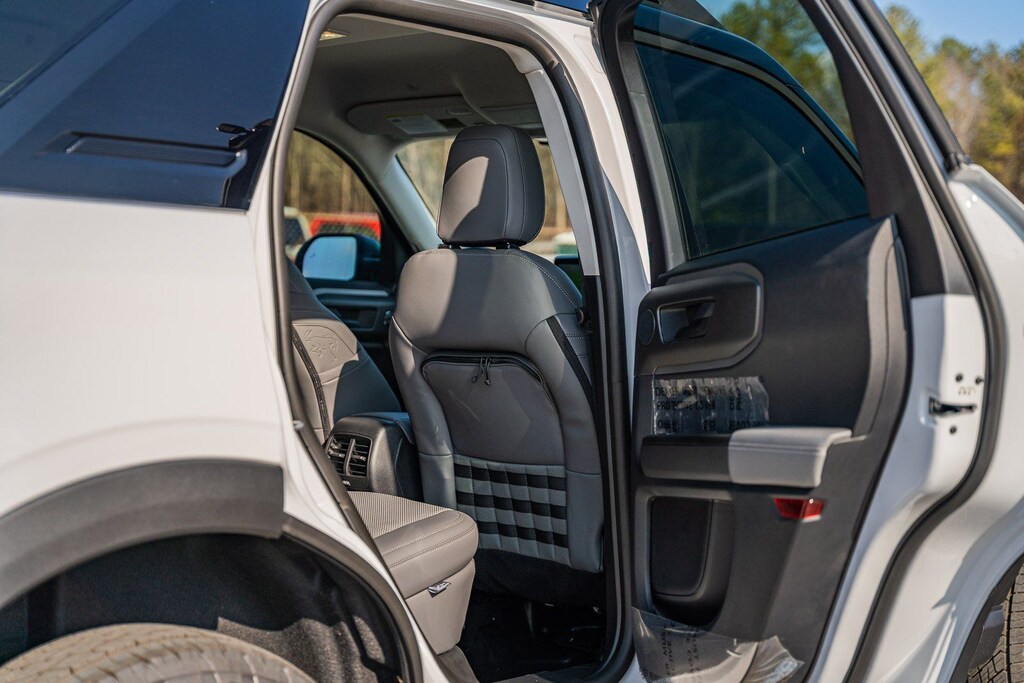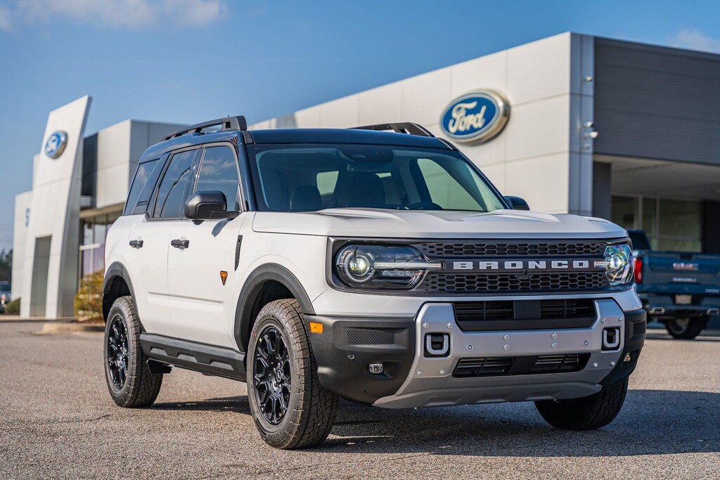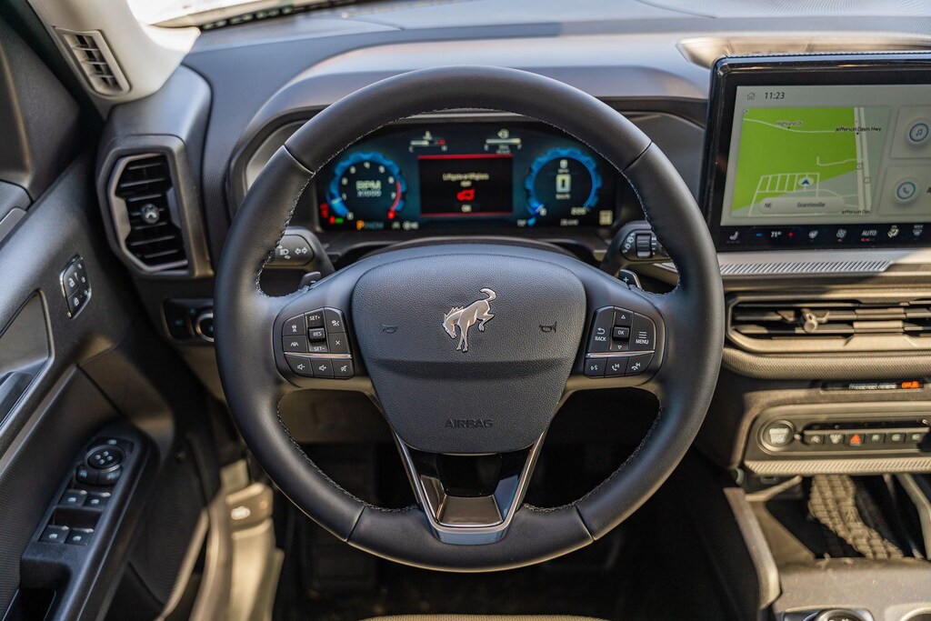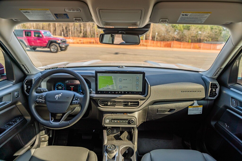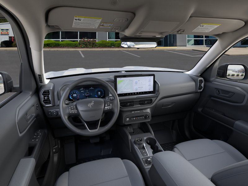 This vehicle comes equipped with Badlands Tech Package (B&O Sound System by Bang & Olufsen, Connected Navigation, and HD Radio), Equipment Group 400A, 4-Wheel Disc Brakes, 6 Speakers, ABS brakes, Air Conditioning, Alloy wheels, AM/FM radio: SiriusXM, AM/FM Stereo, Auto High-beam Headlights, Auto-dimming Rear-View mirror, Automatic temperature control, Brake assist, Compass, Delay-off headlights, Driver door bin, Driver vanity mirror, Dual front impact airbags, Dual front side impact airbags, Electronic Stability Control, Emergency communication system: SYNC 4 911 Assist, Four wheel independent suspension, Front & Rear Floor Liners w/o Carpet Mats, Front anti-roll bar, Front Bucket Seats, Front Center Armrest, Front fog lights, Front License Plate Bracket, Front reading lights, Fully automatic headlights, Garage door transmitter, Heated door mirrors, Heated front seats, Heated steering wheel, Illuminated entry, Knee airbag, Leather Trimmed Front Bucket Seats, Low tire pressure warning, Memory seat, Occupant sensing airbag, Outside temperature display, Overhead airbag, Overhead console, Panic alarm, Passenger door bin, Passenger vanity mirror, Power door mirrors, Power driver seat, Power passenger seat, Power steering, Power windows, Radio data system, Rear anti-roll bar, Rear reading lights, Rear seat center armrest, Rear window defroster, Rear window wiper, Remote keyless entry, Security system, SiriusXM, Speed control, Speed-sensing steering, Speed-Sensitive Wipers, Split folding rear seat, Steering wheel mounted audio controls, SYNC 4 w/Enhanced Voice Recognition, Tachometer, Telescoping steering wheel, Tilt steering wheel, Traction control, Trip computer, Variably intermittent wipers, and Wheels: 17" Matte Black-Painted Aluminum.