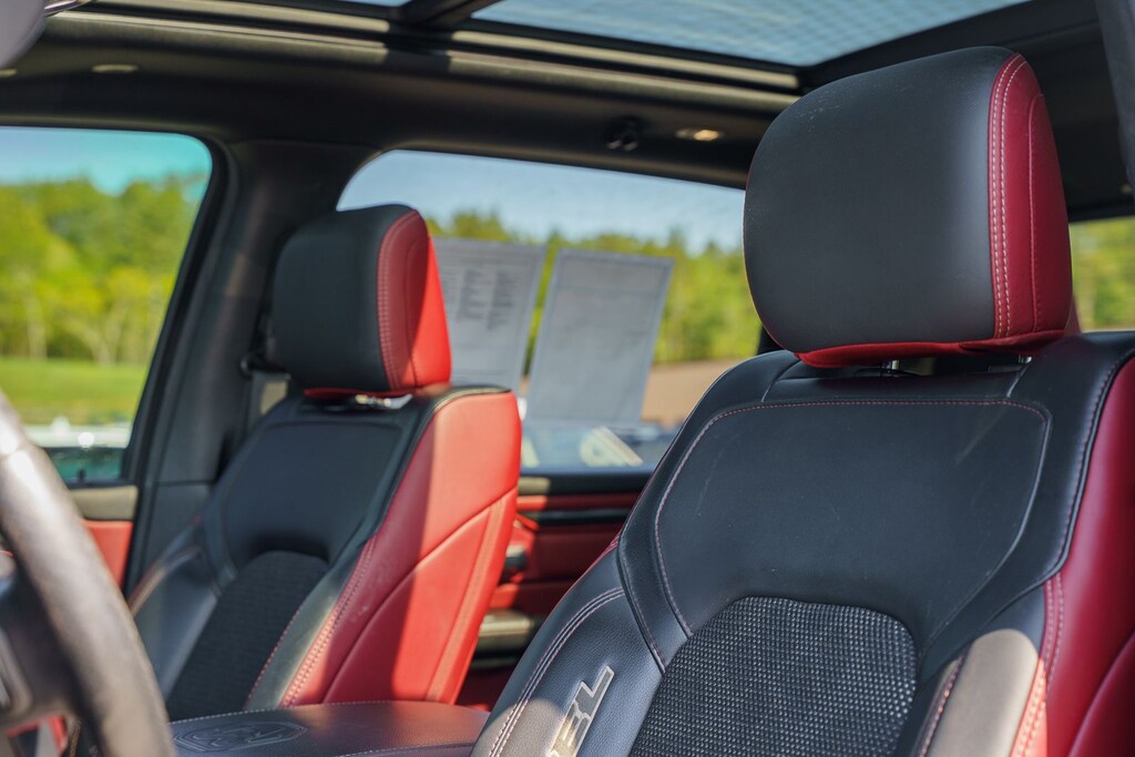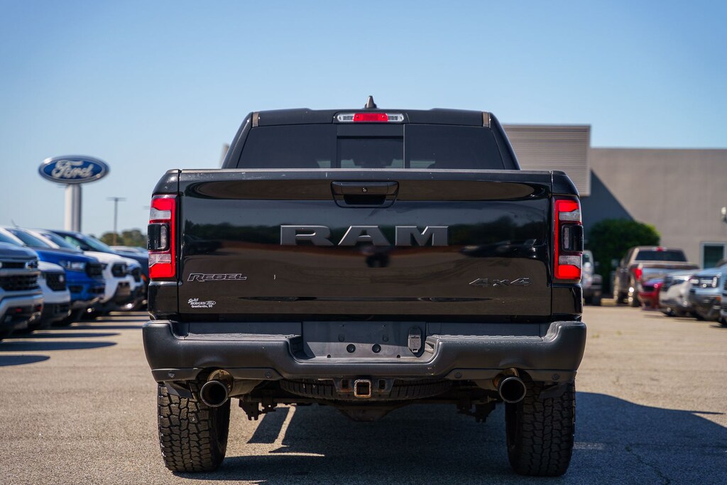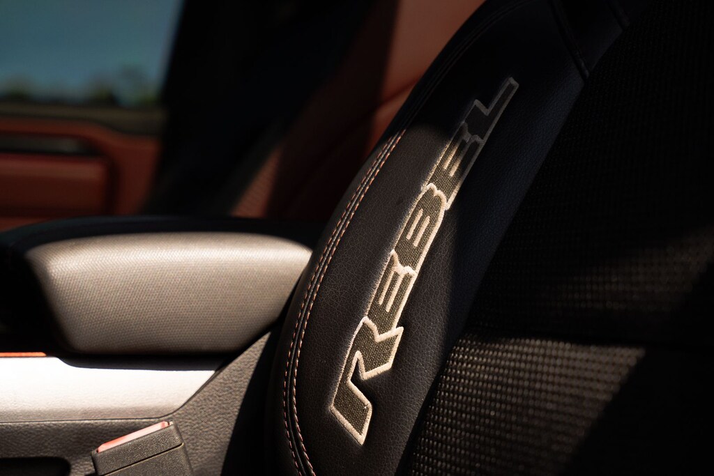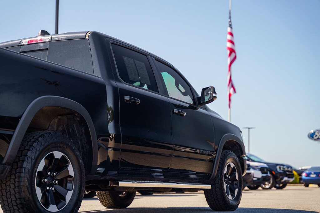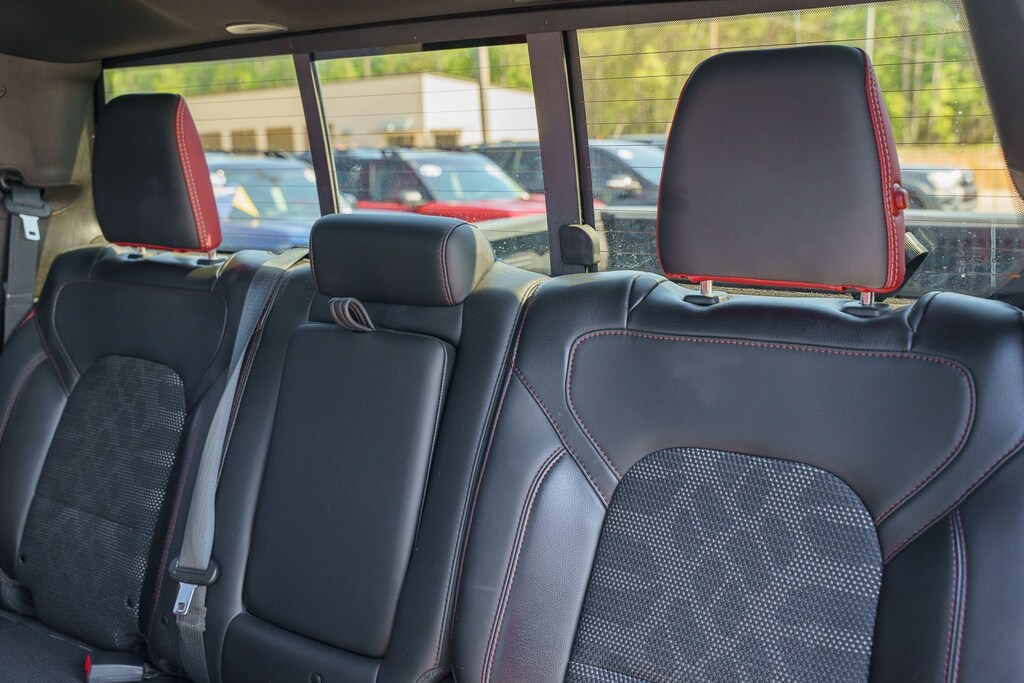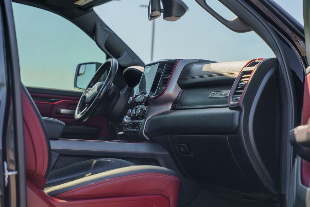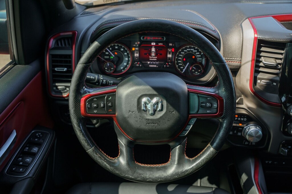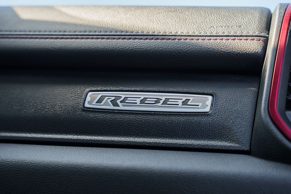 This vehicle comes equipped with Quick Order Package 25W Rebel (Body Color Door Handles), Rebel Level 2 Equipment Group (115V Auxiliary Rear Power Outlet, 2 USB Full Function/Charge Only Media Hub, 8.4" Touchscreen Display, Air Conditioning ATC w/Dual Zone Control, Apple CarPlay, Auto-Dimming Exterior Driver Mirror, Auto-Dimming Rear-View Mirror, Exterior Mirrors Courtesy Lamps, Exterior Mirrors w/Supplemental Signals, Foam Bottle Insert (Door Trim Panel), Google Android Auto, Heated Front Seats, Heated Steering Wheel, Integrated Center Stack Radio, ParkSense Front/Rear Park Assist w/Stop, Power Adjustable Pedals, Power Heated Fold Away Mirrors, Power-Folding Mirrors, Radio: Uconnect 4 w/8.4" Display, Rain Sensitive Windshield Wipers, Rear Dome w/On/Off Switch Lamp, Rear Underseat Compartment Storage, Rear Window Defroster, Remote Proximity Keyless Entry, Remote Start System, Security Alarm, Single Disc Remote CD Player, Sun Visors w/Illuminated Vanity Mirrors, and Universal Garage Door Opener), Ford Blue Certified Eligible Certified, 1-Year SiriusXM Radio Service, 1-Yr SiriusXM Guardian Trial, 3.92 Rear Axle Ratio, 4-Wheel Disc Brakes, 48V Belt Starter Generator, 5-Year SiriusXM Traffic Service, 5-Year SiriusXM Travel Link Service, 6 Speakers, ABS brakes, Air Conditioning, Alloy wheels, AM/FM radio: SiriusXM, Brake assist, Cloth/Vinyl Low Back Bucket Seats, Compass, Delay-off headlights, Disassociated Touchscreen Display, Dome Dual LED Reading Lamp, Driver door bin, Dual front impact airbags, Dual front side impact airbags, Dual-Pane Panoramic Sunroof, Electronic Stability Control, For Details, Visit DriveUconnect.com, For More Info, Call 800-643-2112, Front anti-roll bar, Front Bucket Seats, Front Center Armrest w/Storage, Front fog lights, Front reading lights, Front wheel independent suspension, Fully automatic headlights, GPS Antenna Input, GPS Navigation, HD Radio, Heated door mirrors, Illuminated entry, Leather steering wheel, Low tire pressure warning, Manufacturer's Statement of Origin, No Satellite Coverage w/HI/AK/PR/VI/GU, Occupant sensing airbag, Outside temperature display, Overhead airbag, Overhead console, Overhead LED Lamps, Panic alarm, ParkView Rear Back-Up Camera, Passenger door bin, Passenger vanity mirror, Power door mirrors, Power driver seat, Power steering, Power windows, Premium Overhead Console, Radio data system, Radio: Uconnect 3 w/5" Display, Radio: Uconnect 4C Nav w/8.4" Display, Rear anti-roll bar, Rear seat center armrest, Rear step bumper, Remote keyless entry, SiriusXM Satellite Radio, SiriusXM Traffic Plus, SiriusXM Travel Link, Speed control, Split folding rear seat, Steering wheel mounted audio controls, Tachometer, Telescoping steering wheel, Tilt steering wheel, Traction control, Trip computer, Variably intermittent wipers, Voltmeter, and Wheels: 18" x 8" Painted Black.
