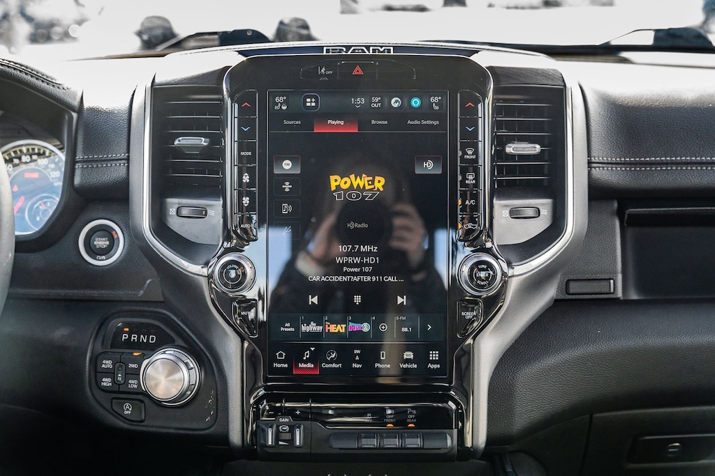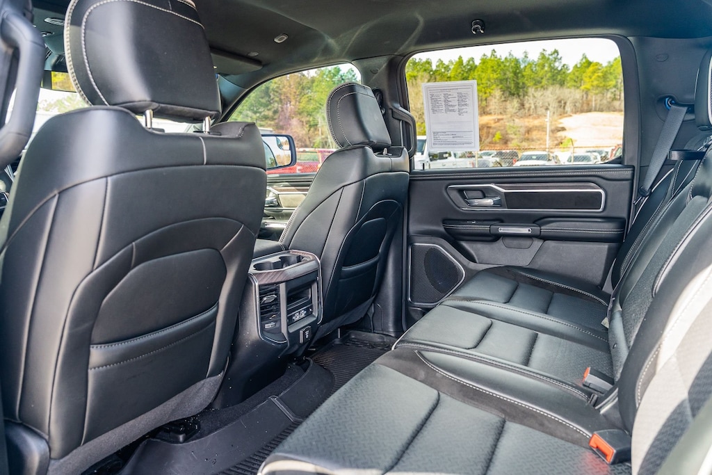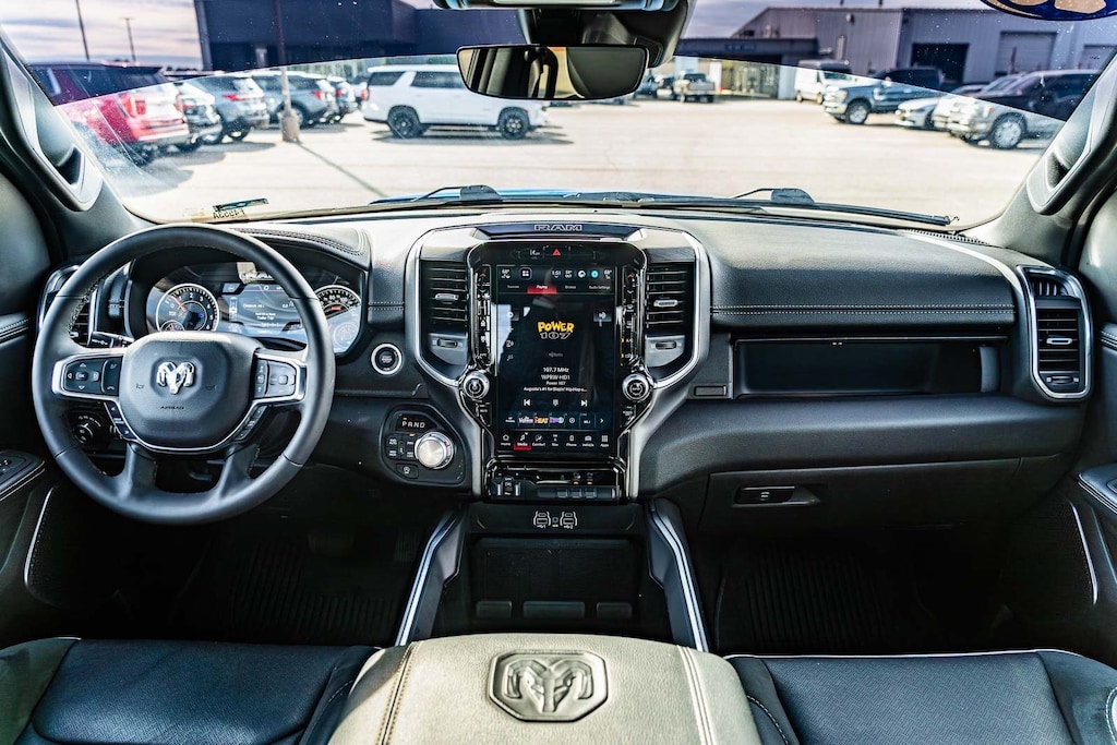 This vehicle comes equipped with Laramie Level 1 Equipment Group (Rain Sensitive Windshield Wipers and Remote Tailgate Release), Quick Order Package 21H Laramie, Ram Certified, 10 Speakers, 3 Rear Seat Head Restraints, 3.55 Rear Axle Ratio, 4 Way Front Headrests, 4-Wheel Disc Brakes, 4G LTE Wi-Fi Hot Spot, ABS brakes, Air Conditioning, Alloy wheels, AM/FM radio: SiriusXM with 360L, Apple CarPlay, Apple CarPlay/Android Auto, Audio memory, Auto High-beam Headlights, Auto Power-Folding Mirrors, Auto-dimming door mirrors, Auto-Dimming Exterior Driver Mirror, Auto-dimming Rear-View mirror, Automatic temperature control, Brake assist, Bumpers: chrome, Chrome Exterior Mirrors, Compass, Connected Travel & Traffic Services, Connectivity - US/Canada, Convex Wide-Angle Exterior Mirror Insert, Delay-off headlights, Driver door bin, Driver Seat Memory, Driver vanity mirror, Dual front impact airbags, Dual front side impact airbags, Electronic Stability Control, Exterior Mirrors Courtesy Lamps, Exterior Mirrors w/Heating Element, Exterior Mirrors w/Memory, Exterior Mirrors w/Supplemental Signals, Front anti-roll bar, Front Center Armrest w/Storage, Front dual zone A/C, Front fog lights, Front reading lights, Front Seat Back Map Pockets, Front wheel independent suspension, Fully automatic headlights, Garage door transmitter, Google Android Auto, GPS Antenna Input, GPS Navigation, HD Radio, Heated door mirrors, Heated Front Seats, Heated front seats, Heated rear seats, Heated Steering Wheel, Heated steering wheel, Illuminated entry, Integrated Voice Command w/Bluetooth, Leather steering wheel, Leather Trim 40/20/40 Bench Seat, Low tire pressure warning, Memory seat, Navigation System, Occupant sensing airbag, Outside temperature display, Overhead airbag, Overhead console, Panic alarm, ParkView Rear Back-Up Camera, Passenger door bin, Passenger vanity mirror, Power 2-Way Driver Lumbar Adjust, Power 2-Way Passenger Lumbar Adjust, Power Adjust 8-Way Front Passenger Seat, Power door mirrors, Power driver seat, Power passenger seat, Power steering, Power windows, Radio data system, Radio: Uconnect 5 Nav w/12.0" Display, RAM Grille Badge - Chrome, Rear anti-roll bar, Rear reading lights, Rear seat center armrest, Rear step bumper, Remote keyless entry, Security system, SiriusXM w/360L, Speed control, Split folding rear seat, Steering wheel mounted audio controls, Tachometer, Telescoping steering wheel, Tilt steering wheel, Traction control, Trailer Brake Control, Trip computer, Turn signal indicator mirrors, USB Host Flip, Variably intermittent wipers, Ventilated Front Seats, Ventilated front seats, Voltmeter, and Wheels: 20" x 9" Premium Paint/Polish.