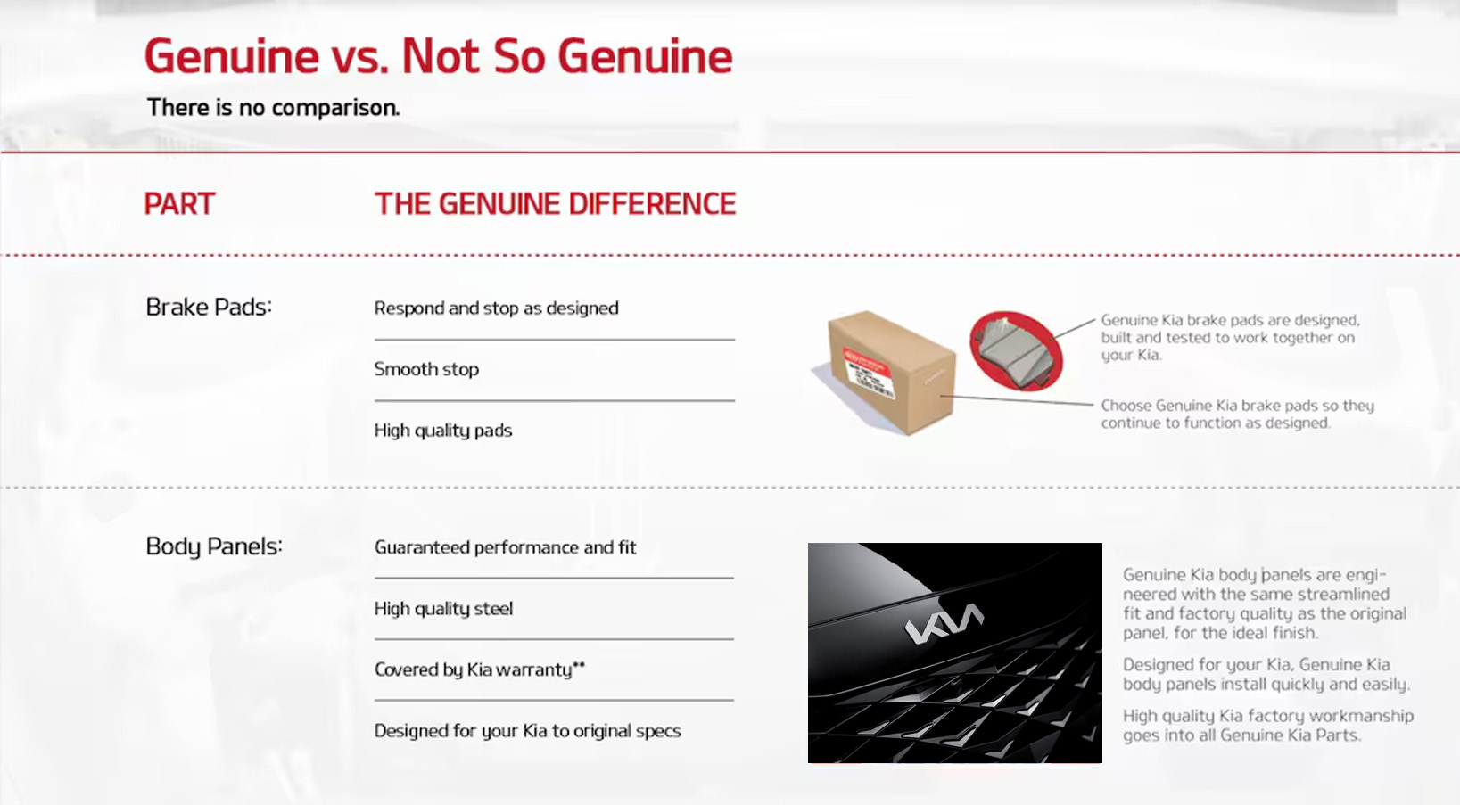 | Counterfeit parts are usually designed to deceive consumers by copying the appearance of Genuine Kia Parts, but are not made for, nor distributed by Kia. Often sourced from distributors outside the country, these parts may look identical or be boxed similarly to Genuine Kia Parts, but are not. Counterfeit parts are likely untested for vehicle safety, fit, or function. |
