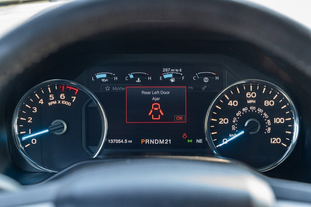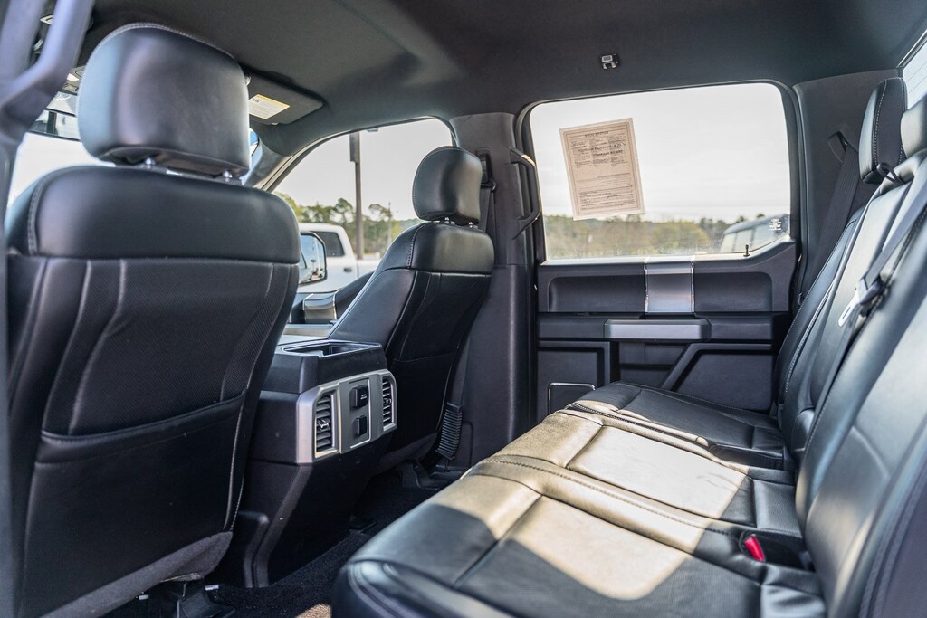 This vehicle comes equipped with Equipment Group 501A Mid (110V/400W Outlet, BLIS Blind Spot Information System, LED Side-Mirror Spotlights, Power Glass Sideview Mirr w/Body-Color Skull Caps, Remote Start System w/Remote Tailgate Release, Reverse Sensing System, and Universal Garage Door Opener), FX4 Off-Road Package (4x4 FX4 Off-Road Bodyside Decal, Front & Rear Off-Road Tuned Shock Absorbers, and Hill Descent Control), GVWR: 6,500 lbs Payload Package, Lariat Sport Appearance Package (Accent-Color 3-Bar Style Grille, Accent-Color Angular Step Bars, Body-Color Front & Rear Bumpers, Box Side Decal, Single-Tip Chrome Exhaust, and Wheels: 18" 6-Spoke Machined-Aluminum), Trailer Tow Package (Auxiliary Transmission Oil Cooler, Class IV Trailer Hitch Receiver, Pro Trailer Backup Assist, and Upgraded Front Stabilizer Bar), 4WD, 18" Machined-Aluminum Wheels, 3.55 Axle Ratio, 4-Wheel Disc Brakes, 7 Speakers, ABS brakes, Adjustable pedals, Air Conditioning, Alloy wheels, AM/FM radio: SiriusXM, Auto-dimming door mirrors, Auto-dimming Rear-View mirror, Automatic temperature control, Brake assist, Bumpers: chrome, CD player, Compass, Delay-off headlights, Driver door bin, Driver vanity mirror, Dual front impact airbags, Dual front side impact airbags, Electronic Stability Control, Exterior Parking Camera Rear, Front anti-roll bar, Front Center Armrest w/Storage, Front dual zone A/C, Front fog lights, Front reading lights, Front wheel independent suspension, Fully automatic headlights, Heated door mirrors, Heated front seats, Illuminated entry, Leather-Trimmed 40/20/40 Front Seat, Low tire pressure warning, Memory seat, Occupant sensing airbag, Outside temperature display, Overhead airbag, Overhead console, Panic alarm, Passenger door bin, Passenger vanity mirror, Pedal memory, Power door mirrors, Power driver seat, Power passenger seat, Power steering, Power windows, Radio data system, Radio: Single-CD w/SiriusXM Satellite, Rear reading lights, Rear seat center armrest, Rear step bumper, Rear window defroster, Remote keyless entry, Security system, Speed control, Speed-sensing steering, Split folding rear seat, Steering wheel mounted audio controls, SYNC 3, Tachometer, Tailgate Step w/Tailgate Lift Assist, Telescoping steering wheel, Tilt steering wheel, Traction control, Trip computer, Turn signal indicator mirrors, Variably intermittent wipers, Ventilated front seats, Voltmeter, and Wheels: 20" 6-Spoke Premium Painted Aluminum.