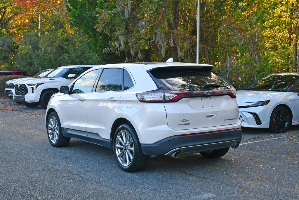***Stokes Toyota Hilton Head*** 2017 Ford Edge Titanium in White Platinum Metallic Tri-Coat, Factory Equipped With: 110V/400W AC Power Outlet, 2nd Row Outboard Inflatable Safety Belts, Auto-Dimming Driver's Sideview Mirror, BLIS Blind Spot Information System, Enhanced Active Park Assist System, Equipment Group 302A, Front 180 Degree Camera, Heated Rear-Seats, HID Projector-Style Headlamps w/Auto High Beams, Lane-Keeping System, Panoramic Vista Roof, Perforated Leather Trimmed Heated/Cooled Buckets, Radio: AM/FM Stereo w/Single CD/Navigation, Rain-Sensing Wipers, Remote Start System, SiriusXM Radio, SiriusXM Traffic & Travel Link, Technology Package.