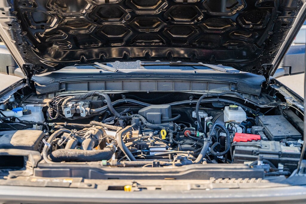 This vehicle comes equipped with 4-Wheel Disc Brakes, 4.46 Axle Ratio, 6 Speakers, ABS brakes, Air Conditioning, AM/FM radio: SiriusXM with 360L, AM/FM Stereo, Auto High-beam Headlights, Brake assist, Cloth Bucket Seats, Compass, Convertible HardTop, Convertible roof lining, Delay-off headlights, Driver door bin, Driver vanity mirror, Dual front impact airbags, Dual front side impact airbags, Emergency communication system: 911 Assist, Exterior Parking Camera Rear, Front anti-roll bar, Front Bucket Seats, Front Center Armrest, Front reading lights, Front wheel independent suspension, Fully automatic headlights, Glass rear window, Heated door mirrors, Illuminated entry, Integrated roll-over protection, Low tire pressure warning, Occupant sensing airbag, Outside temperature display, Overhead airbag, Overhead console, Panic alarm, Passenger door bin, Passenger vanity mirror, Power door mirrors, Power steering, Power windows, Radio data system, Rear window defroster, Rear window wiper, Remote keyless entry, Security system, SiriusXM Radio w/360L, Speed control, Split folding rear seat, Steering wheel mounted audio controls, SYNC 4, Tachometer, Telescoping steering wheel, Tilt steering wheel, Traction control, Trip computer, Variably intermittent wipers, and Wheels: 16" Bright Polished Silver-Painted Steel.
