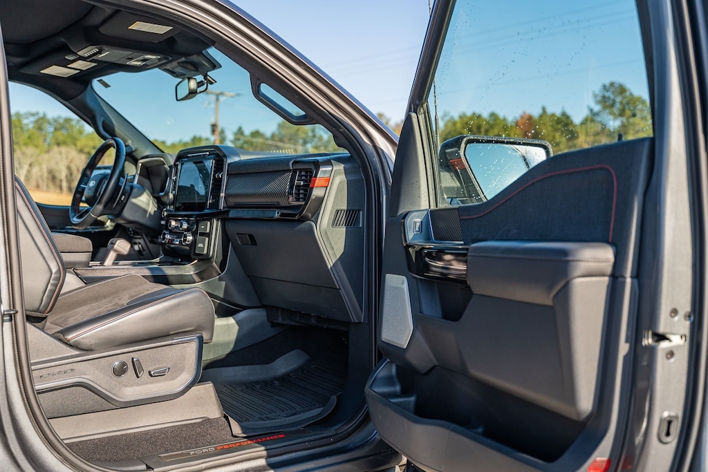 This vehicle comes equipped with Equipment Group 802A Raptor R (17" Forged Aluminum Bead-Lock Capable Wheels, Black Exterior Accents, Carbon Fiber Interior Appliques, Code Orange Stitching Doors & Instrument Panel, Code Orange Tow Hooks, Interior Code Orange Raptor R Badging, Partitioned Lockable Fold-Flat Storage, Raptor R Badge Tailgate Applique, Recaro Black w/Orange Stitching Front Seats, Unique Hood Vent w/R Badge, and Unique Raptor R Grille w/R Badge), GVWR: 7,300 lbs Payload Package, GVWR: 7,450 lbs Payload Package, Moonroof & Tailgate (Power Tailgate and Twin Panel Moonroof), 4WD, 17" Cast Aluminum Wheels, 18 Speakers, 4-Wheel Disc Brakes, ABS brakes, Adaptive suspension, Adjustable pedals, Air Conditioning, Alloy wheels, AM/FM radio: SiriusXM with 360L, Auto High-beam Headlights, Auto tilt-away steering wheel, Auto-dimming door mirrors, Auto-dimming Rear-View mirror, Automatic temperature control, Brake assist, Bumpers: body-color, Compass, Delay-off headlights, Driver door bin, Driver vanity mirror, Dual front impact airbags, Dual front side impact airbags, Electronic Locking w/4.10 Axle Ratio, Electronic Stability Control, Emergency communication system, Exterior Parking Camera Rear, Front anti-roll bar, Front Bucket Seats, Front Center Armrest, Front dual zone A/C, Front fog lights, Front License Plate Bracket, Front reading lights, Front wheel independent suspension, Fully automatic headlights, Garage door transmitter, Heated door mirrors, Heated front seats, Heated rear seats, Heated steering wheel, Illuminated entry, Inclination/Intrusion Sensor Removal, Lane Departure Warning System, Leather Trim Seats w/Heated 2nd Row, Low tire pressure warning, Memory seat, Navigation system: Connected Navigation, Occupant sensing airbag, Outside temperature display, Overhead airbag, Overhead console, Panic alarm, Passenger door bin, Passenger vanity mirror, Pedal memory, Power door mirrors, Power driver seat, Power passenger seat, Power steering, Power windows, Radio data system, Radio: B&O Unleashed Sound System by Bang & Olufsen, Rain sensing wipers, Raptor 37 Graphics, Rear reading lights, Rear step bumper, Rear window defroster, Remote keyless entry, Security system, Speed control, Speed-sensing steering, Split folding rear seat, Steering Wheel Heat Removal (DISC), Steering wheel memory, Steering wheel mounted audio controls, SYNC 4 w/Enhanced Voice Recognition, Tachometer, Telescoping steering wheel, Tilt steering wheel, Traction control, Trip computer, Turn signal indicator mirrors, Variably intermittent wipers, and Ventilated front seats.