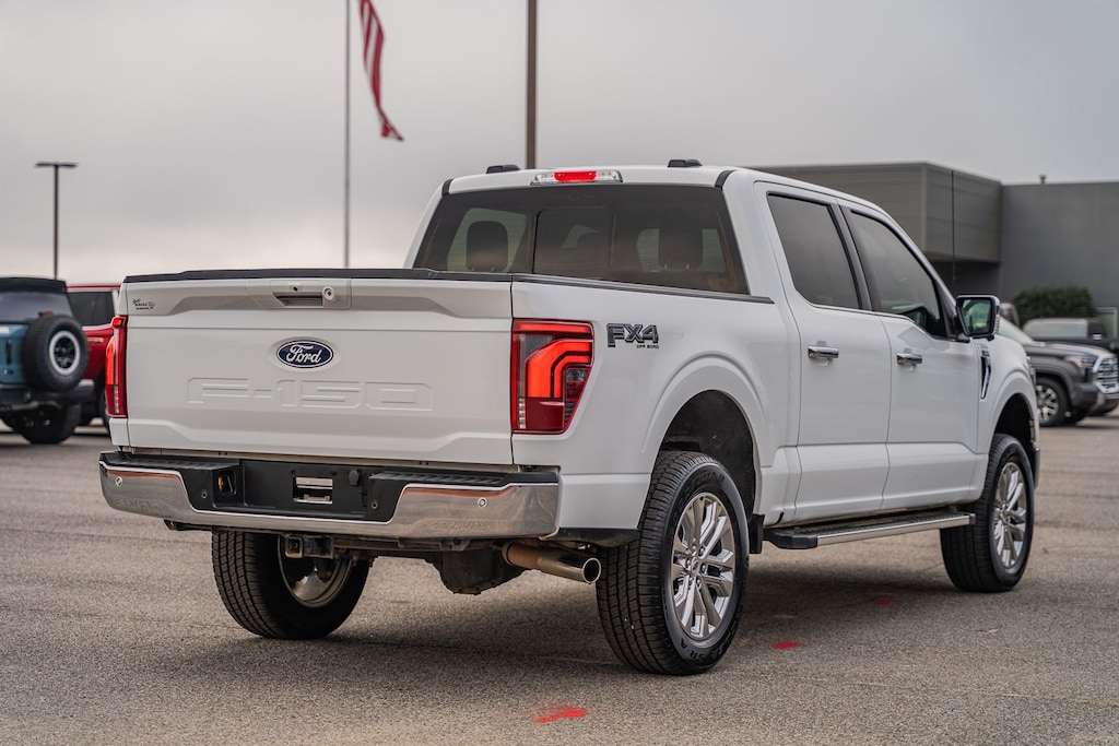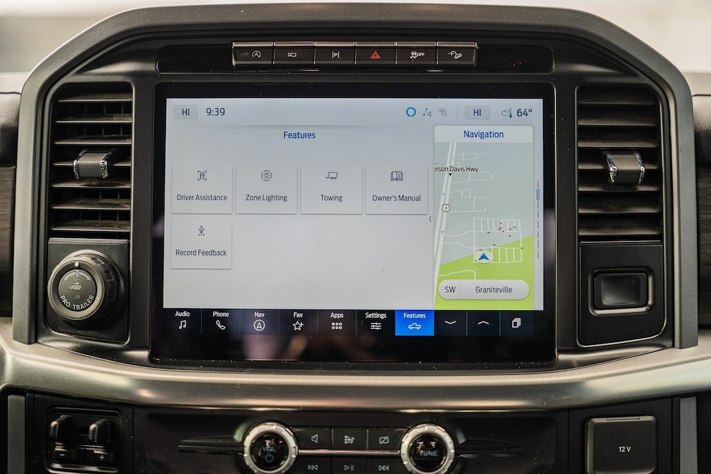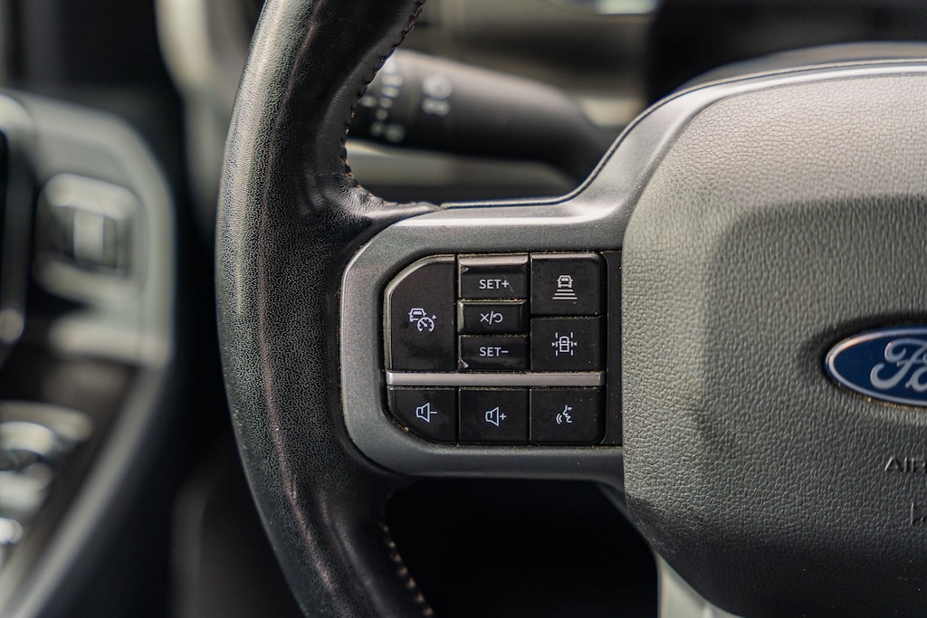 This vehicle comes equipped with Equipment Group 501A Standard, FX4 Off-Road Package (4x4 FX4 Off-Road Bodyside Decal, Hill Descent Control, Monotube Rear Shocks, Off-Road Tuned Front Shock Absorbers, and Rock Crawl Mode), Tow/Haul Package (Integrated Trailer Brake Controller), 4WD, 4-Wheel Disc Brakes, 8 Speakers, ABS brakes, Adjustable pedals, Air Conditioning, Alloy wheels, AM/FM radio: SiriusXM with 360L, Auto High-beam Headlights, Auto-dimming door mirrors, Auto-dimming Rear-View mirror, Automatic temperature control, Brake assist, Bumpers: chrome, Chrome wheels, Compass, Delay-off headlights, Driver door bin, Driver vanity mirror, Dual front impact airbags, Dual front side impact airbags, Electronic Stability Control, Emergency communication system: SYNC 4 911 Assist, Front anti-roll bar, Front Bucket Seats, Front Center Armrest, Front dual zone A/C, Front fog lights, Front reading lights, Front wheel independent suspension, Fully automatic headlights, Garage door transmitter, Heated door mirrors, Heated front seats, Heated steering wheel, Illuminated entry, Leather-Trimmed Bucket Seats, LED Sideview Mirror Spotlights, Low tire pressure warning, Memory seat, Navigation system: Connected Navigation, Occupant sensing airbag, Outside temperature display, Overhead airbag, Overhead console, Panic alarm, Passenger door bin, Passenger vanity mirror, Pedal memory, Power door mirrors, Power driver seat, Power passenger seat, Power steering, Power windows, Radio data system, Radio: B&O Sound System by Bang & Olufsen, Rain sensing wipers, Rear reading lights, Rear seat center armrest, Rear step bumper, Rear window defroster, Remote keyless entry, Security system, Speed control, Split folding rear seat, Steering wheel mounted audio controls, SYNC 4 w/Enhanced Voice Recognition, Tachometer, Telescoping steering wheel, Tilt steering wheel, Traction control, Trip computer, Turn signal indicator mirrors, Variably intermittent wipers, Ventilated front seats, Voltmeter, and Wheels: 20" Chrome-Like PVD.