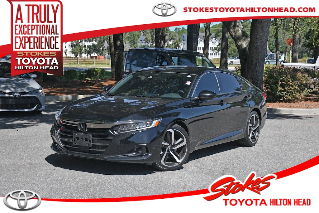 ***Stokes Toyota Hilton Head*** 2022 Honda Accord Sport in Crystal Black Pearl, Factory Equipped With: Power Windows, Power Locks, Cruise Control, Remote Keyless Entry, Integrated Back Up Camera, Alloy Wheels, 8 Speakers, ABS brakes, Adaptive Cruise Control: Adaptive Cruise Control (ACC) with Low-Speed Follow, Air Conditioning, Alloy wheels, Apple CarPlay/Android Auto, Automatic temperature control, Brake assist, Bumpers: body-color, Dual front impact airbags, Dual front side impact airbags, Electronic Stability Control, Fabric w/Synthetic Leather Seat Trim, Front Bucket Seats, Fully automatic headlights, Lane Departure Warning System, Leather Shift Knob, Leather steering wheel, Low tire pressure warning, Panic alarm, Power door mirrors, Power driver seat, Power steering, Speed control, Steering wheel mounted audio controls, Tilt steering wheel, Trip computer, Variably intermittent wipers. CARFAX One-Owner.