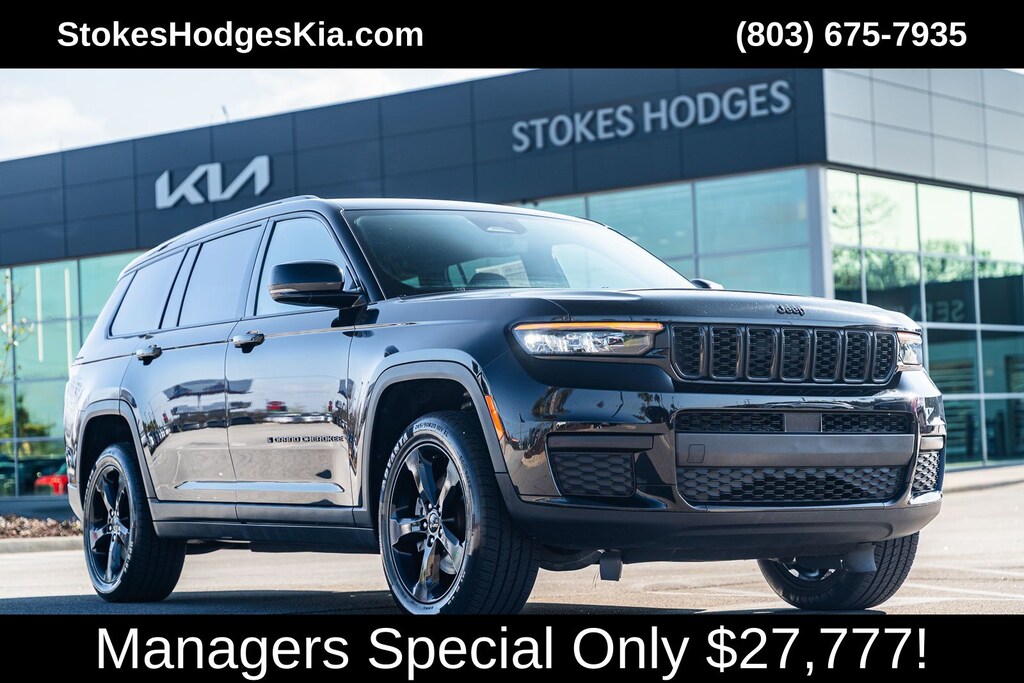 This Grand Cherokee L Altitude includes Altitude Appearance Package, Quick Order Package 23B Altitude (115V Auxiliary Power Outlet, 3rd Row Charge-Only USB Ports, Black Headliner, Capri Leatherette/Suede Seats, Delete Laredo Badge, Gloss Black Exterior Accents, Heated Front Seats, Heated Steering Wheel, Molded In Color Black/Gloss Black Roof Rails, Power Liftgate, Rain Sensitive Windshield Wipers, Remote Start System, Selectable Tire Fill Alert, Wheels: 18" x 8.0" Fully Painted Aluminum 1, and Wireless Charging Pad), 2nd Row 60/40 Bench w/Manual Tip/Slide, 2nd Row Seat Center Armrest/Cupholders, 3 Rear Seat Head Restraints, 3.45 Rear Axle Ratio, 3rd row seats: split-bench, 4-Wheel Disc Brakes, 6 Speakers, 7-Passenger Seating, ABS brakes, Air Conditioning, Alloy wheels, Anti-whiplash front head restraints, Automatic temperature control, Brake assist, Bumpers: body-color, Center Rear 3-Point Seat Belt, Cloth Seats, Compass, Delay-off headlights, Driver door bin, Driver vanity mirror, Dual front impact airbags, Dual front side impact airbags, Electronic Stability Control, Emergency communication system, Four wheel independent suspension, Front anti-roll bar, Front Bucket Seats, Front Center Armrest w/Storage, Front dual zone A/C, Front License Plate Bracket, Front reading lights, Fully automatic headlights, Heated door mirrors, Illuminated entry, Knee airbag, Low tire pressure warning, Manual Fold Seatbacks, Normal Duty Suspension, Occupant sensing airbag, Outside temperature display, Overhead airbag, Overhead console, Panic alarm, ParkView Rear Back-Up Camera, Passenger door bin, Passenger vanity mirror, Power door mirrors, Power driver seat, Power steering, Power windows, Radio data system, Radio: Uconnect 5 w/8.4" Display, Rear air conditioning, Rear anti-roll bar, Rear reading lights, Rear window defroster, Rear window wiper, Reclining 3rd row seat, Remote keyless entry, Security system, Speed control, Speed-Sensitive Wipers, Split folding rear seat, Spoiler, Steering wheel mounted audio controls, Tachometer, Telescoping steering wheel, Tilt steering wheel, Traction control, Trip computer, Variably intermittent wipers, Voltmeter, Wheels: 18" x 8.0" Fully Painted Aluminum, and Wheels: 20" x 8.5" Gloss Black Painted Aluminum . While every effort has been made to ensure display of accurate data, the vehicle listings within this web site may not reflect all accurate vehicle items. All Inventory listed is subject to prior sale. The vehicle photo displayed may be an example only. Pricing throughout the web site does not include any options that may have been installed at the dealership. Please see the dealer for details. Vehicles may be in transit or currently in production. Some vehicles are shown with optional equipment. See the actual vehicle for complete accuracy of features, options & pricing. Because of the numerous possible combinations of vehicle models, styles, colors and options, the vehicle pictures on this site may not match your vehicle exactly; however, it will match as closely as possible. Some vehicle images shown are stock photos and may not reflect your exact choice of vehicle, color, trim and specification. Not responsible for pricing or typographical errors. Virtual Inventory, Available Configurations and In-Transit inventory contains vehicles that have not actually been manufactured. These vehicles show consumers sample vehicles that may be available. Pricing, Options, Color, and other data pertaining to these vehicles are provided for example only. All information pertaining to these vehicles should be independently verified through the dealer. 19/26 City/Highway MPG