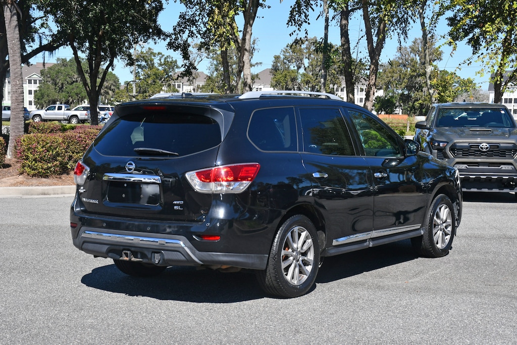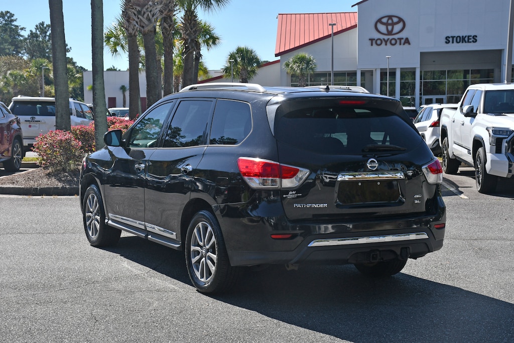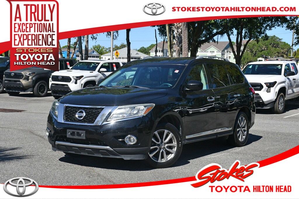 ***Stokes Toyota Hilton Head*** 2015 Nissan Pathfinder SL in Magnetic Black, factory Equipped With. Leather Seats, Power Windows, Power Locks, Cruise Control, Remote Keyless Entry, 8-Way Power Drivers Seat, Integrated Back Up Camera, Alloy Wheels, 4X4, Heated Leather, 18" Alloy Wheels, 3rd row seats: bench, 4-Wheel Disc Brakes, 6 Speakers, 7-Pin Trailer Wiring Harness, ABS brakes, Air Conditioning, Auto-dimming Rear-View mirror, Automatic temperature control, Compass, Dual front impact airbags, Dual front side impact airbags, Front Bucket Seats, Front dual zone A/C, Heated front seats, Leather Seating Surfaces, Low Cost Around View Monitor System, Low tire pressure warning, Panic alarm, Power driver seat, Power Liftgate, Power steering, Rear Parking Sensors, Rear window wiper, SL Tech Package, Tilt steering wheel, Tow Hitch Receiver w/Finisher, Trip computer, Variably intermittent wipers.